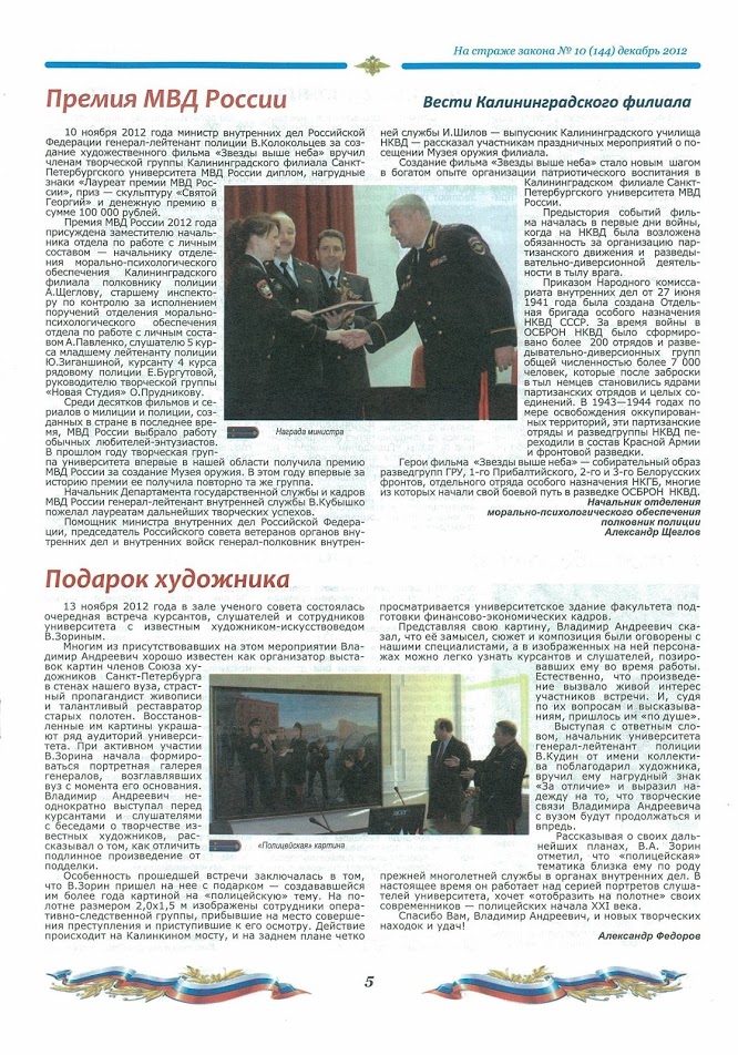 За активную творческую деятельность по формированию должного имиджа сотрудника полиции, укрепление доверия граждан к работе органов внутренних дел, создание высокохудожественных произведений изобразительного искусства и участие в патриотическом воспитании молодежи и студентов, представляем художника Зорина Владимира Андреевича на соискание премии Ленинградского регионального отделения Всероссийской полицейской ассоциации МПА в области литературы и искусства в номинации «Живопись».