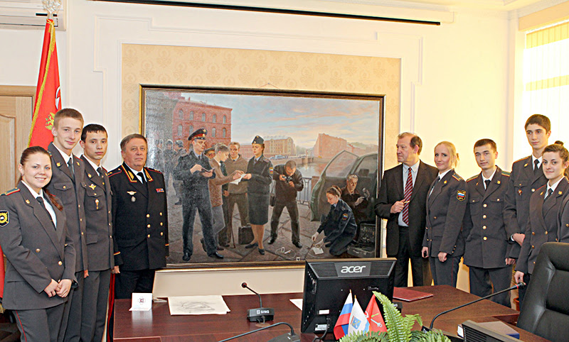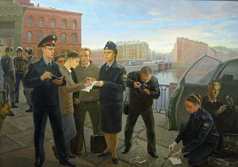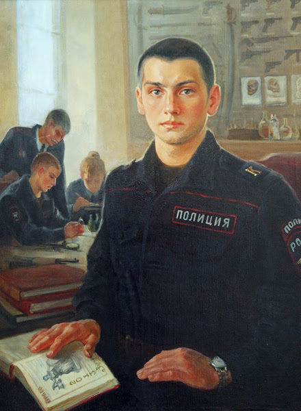 жающих деятельность сотрудников вневедомственной охраны, а также галерею портретов всех руководителей УВО с момента создания этого подразделения в системе МВД. При его непосредственном участии формировалась портретная галерея руководителей Санкт-Петербургского университета МВД России, которые возглавляли его со дня основания. Ряд картин посвящены оперативно-служебной деятельности сотрудников полиции. Так, на одной из них, — «Осмотр места происшествия», можно видеть сотрудников оперативно-следственной группы, работающих на месте совершения преступления. Действие происходит на Калинкином мосту. На заднем плане картины четко просматривается здание факультета подготовки финансово-экономических кадров Университета МВД России. Большим успехом на выставках пользуются и многие другие картины нашего соискателя. Все свои художественные произведения художник преподносит в дар различным подразделениям МВД.